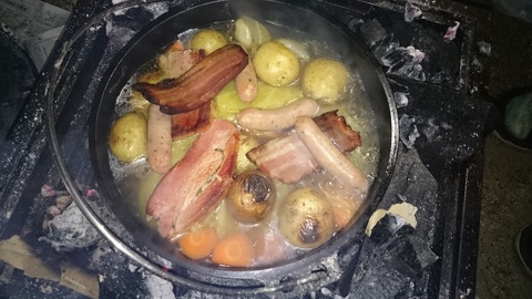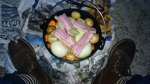 (まずはダッチオーブンにゴロゴロ野菜をぶち込んで・・)