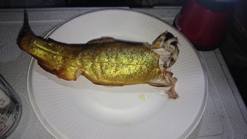 (トガゲにしかみえませんが、釣ったマスの燻製!!うまい!)