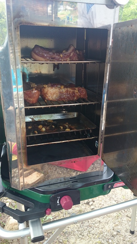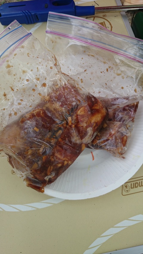 (骨付き肉をニンニク、しょうが、その他いろんなタレで一晩漬け込み・・・)