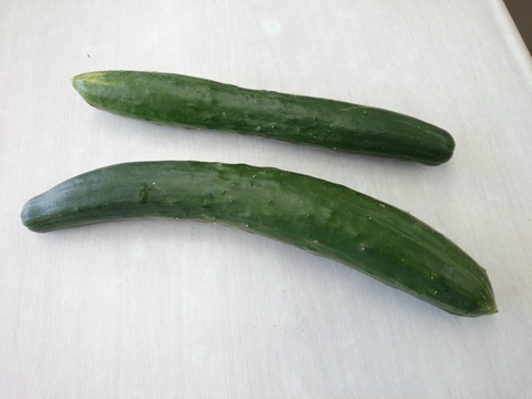 キュウリは1日ですごく大きくなってしまうそうで、上のキュウリが1日で下の大きさに!