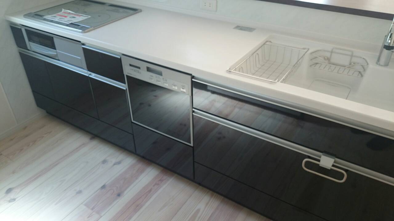 床のホワイトに対して、キッチンもブラック。よく合いますね