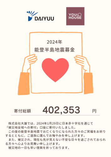 株式会社大雄・ユーハウス・アトリパン工房では、会社内で募金を募り2024年1月29日に日本赤十字社を通じて「被災地全域への寄付」口座へ寄付いたしました。