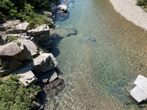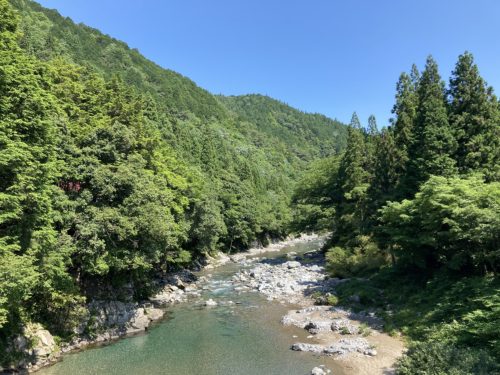 雲一つない青空に川底まで青く透き通った川と深緑の山が相まって、