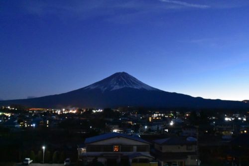 こちらは、旅館の屋上から撮った富士山です。夜で真っ暗だったのですが、一眼レフカメラの機能でこのように撮ることができました。