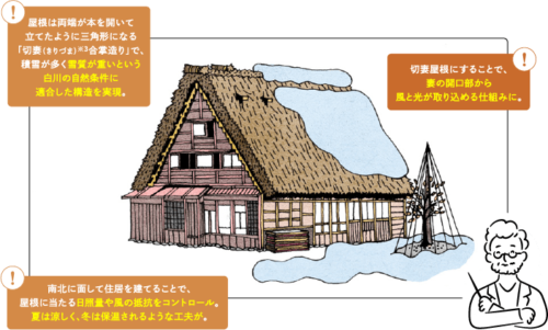 勾配の急な茅葺(かやぶき)屋根を特徴としている住居のことです。