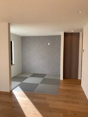 リビングとつながるタタミコーナーはグレイッシュで落ち着く空間に。