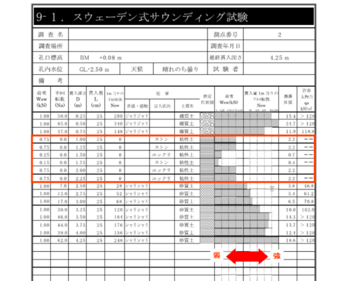 そのため、地面から1~2.25mの深さまでは弱い地盤という判断になります。