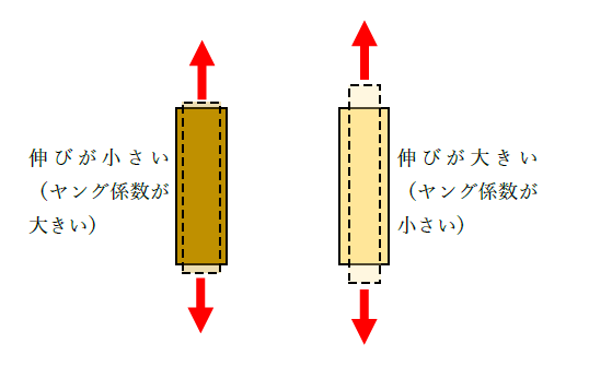 逆にヤング係数が小さいと「柔らかい、伸びやすい」です。