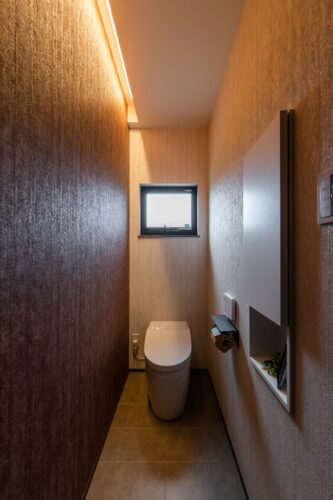 ↓↓こちらは、トイレの天井面に器具を取り付け、壁面を照らす間接照明を入れています!