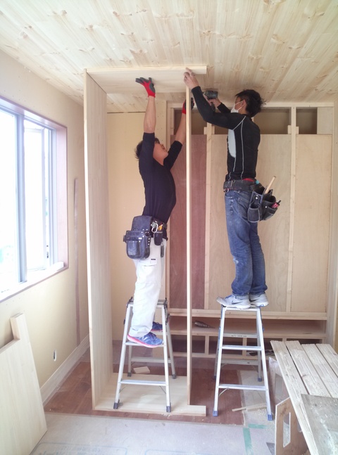 造作 2015.04.20 こんにちは。岡です。 現在進行中のS様邸ですが、作り付けの家具工事があります。 S様とイメージ、施工性など打ち合わせを重ね、現場で大工さんに施工をしてもらっています。 図面、イメージがあっても実際、施工する段階で大工さんと打ち合わせをすると作り込みに難儀する部分があったりしていろいろと考えて造っていきます。 この現場も見学会をやる予定になっているので、お客様の思い、現場での手作り家具等の仕上がりも楽しみに見学会に足を運んでみてください。