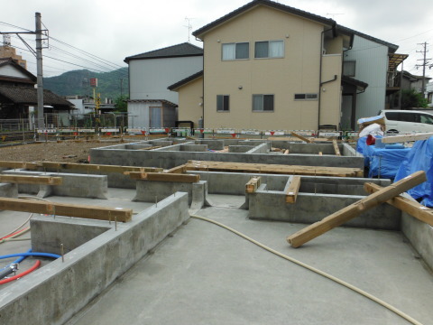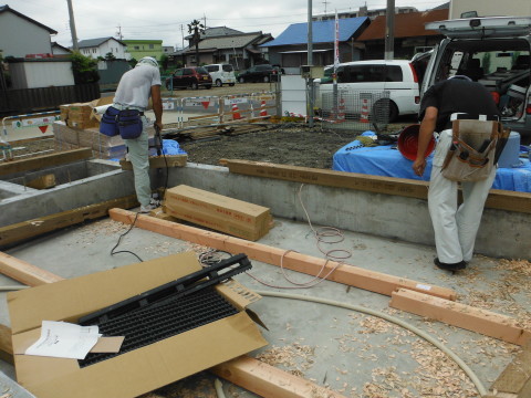 梅雨の一日 2015.06.12 こんにちは、大野です。大安吉日の今日は土台伏せの予定です。しかし、朝のうちは雨が残りごらんの通り基礎の中には雨水が・・・大工さんが来る前にこの道具が必需品、しかしなかなか降りやまない雨にいたちごっこの作業。苦労の甲斐が報われ何とか土台伏せが始まりました。7人の大工さんのおかげで夕方前に戸建賃貸住宅3軒の床組みが終わりました。来週いよいよ上棟です。