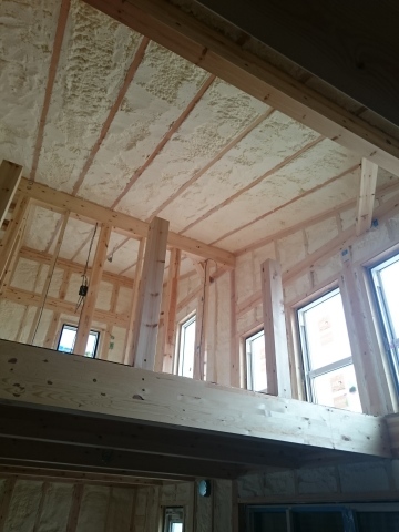 現場の方は外壁工事の進行中、内部はウレタン吹付断熱が終了し造作工事中の状況です。