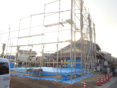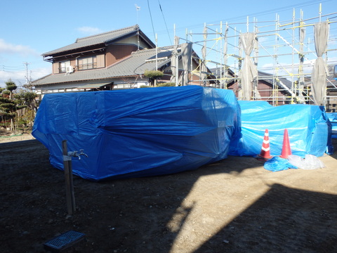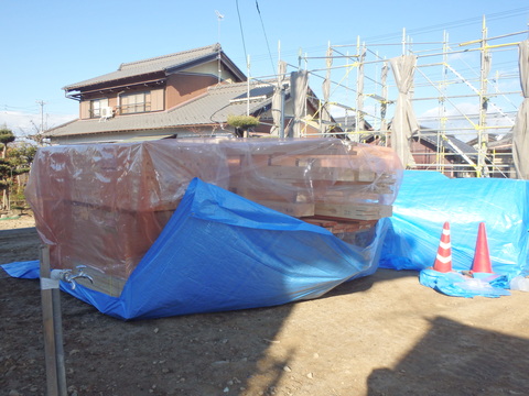 現場状況 2016.01.16 こんにちは、関谷です。今日は、K様邸で建方材料の搬入を行いました。柱材や梁、屋根の材料が入ってきました。来週、雨や雪の予報が出ている為、材料が濡れないように養生を行いました!悪天候で、上棟は延期しましたが しっかり準備しています!