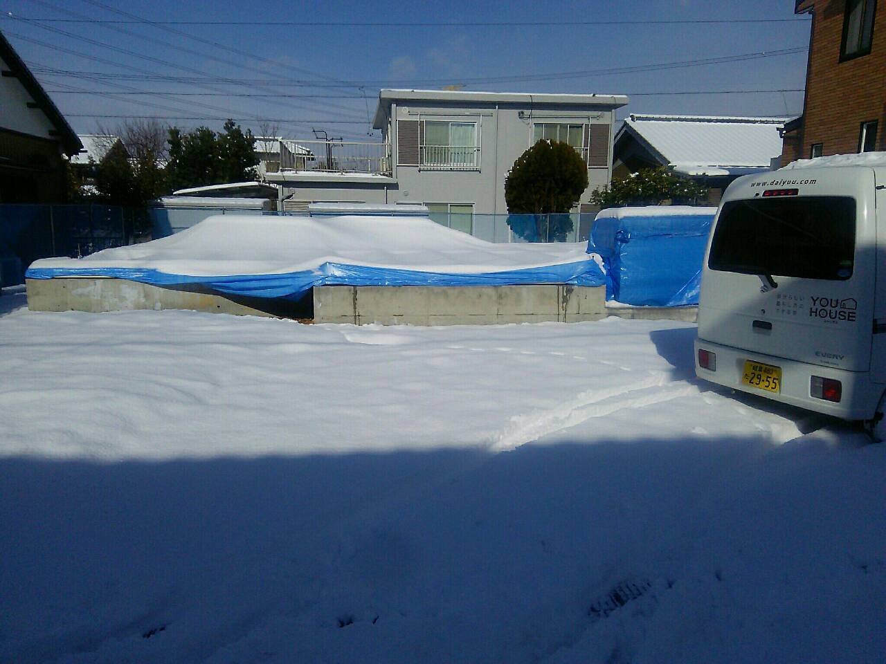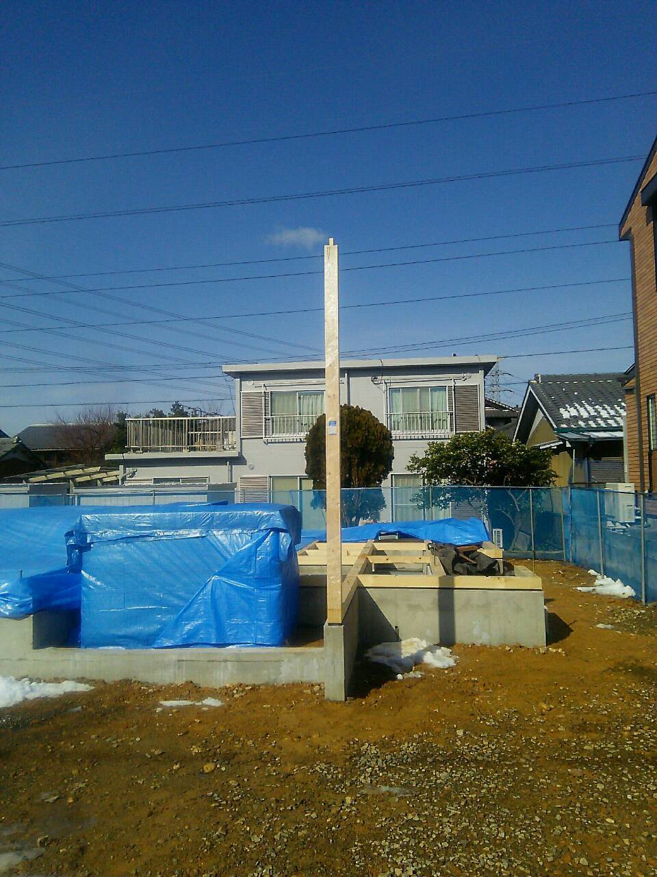 現場状況 2016.01.21 こんにちは、小原です。昨日の降雪で現場の除雪を行いました。結構な量の積雪です。。。除雪中は汗が出るほど大変でした そして本日大安で日柄もよいため柱を1本立てて上棟としました。 レッカーを使う作業は23日に予定しています。