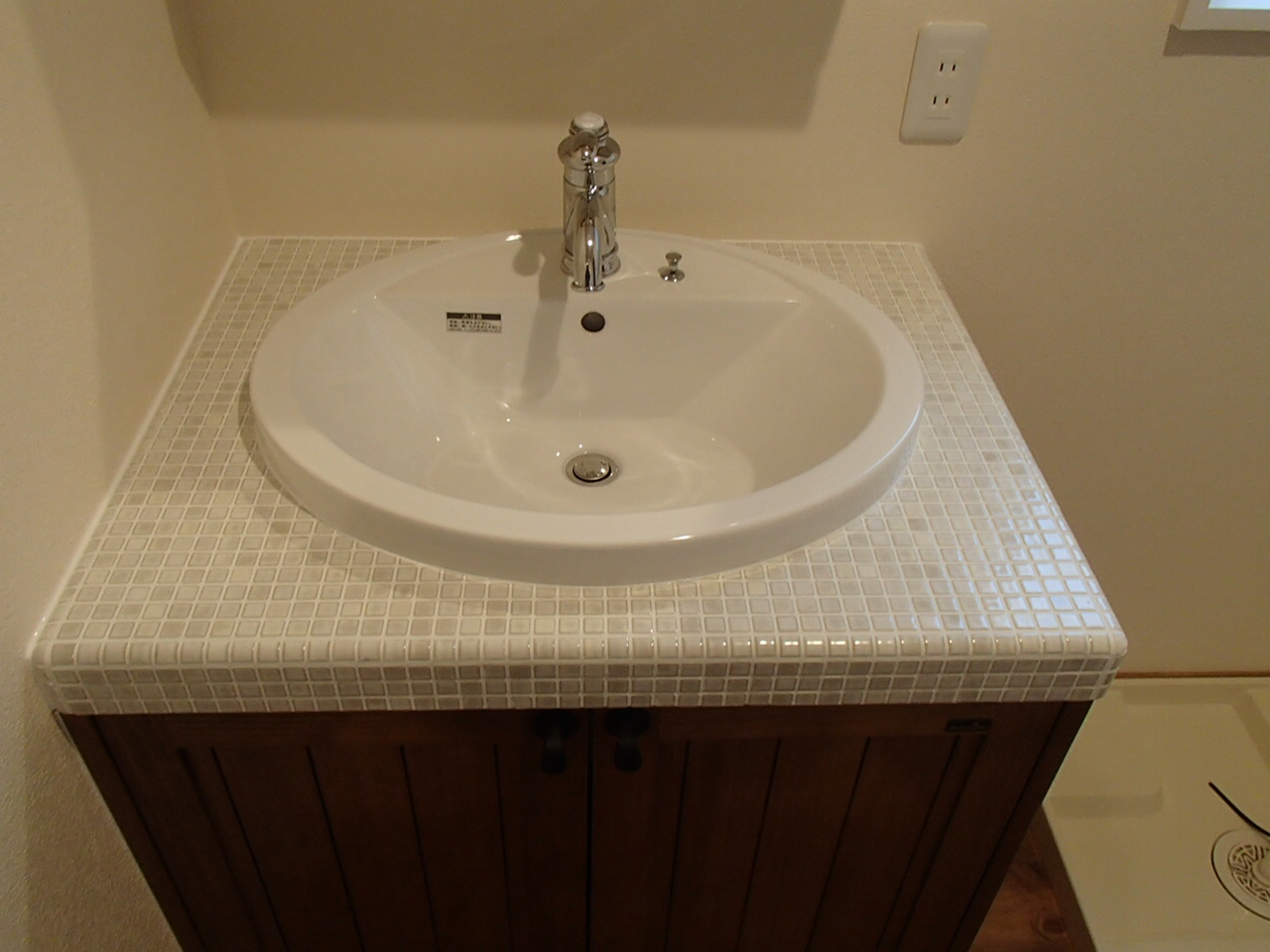 化粧洗面台。 2016.01.29 こんにちは、柘植です。 今日は雨で気温が少し高いためあまり寒くなかったです。 このところ、建物の完成に近い物件がつづき、現場にでかけています。 この中で化粧洗面台があります。 表面台をタイル・木製の架台を塗装した化粧洗面台です。 洗面台の上には鏡棚をつけました。落ち着いた造りとなりました。 みなさんも、洗面台を設置されるならこのような組み合わせをしてみてはどうでしょうか。