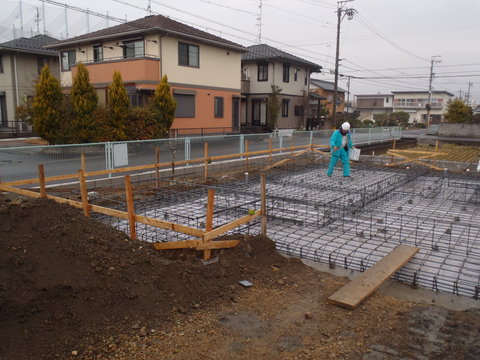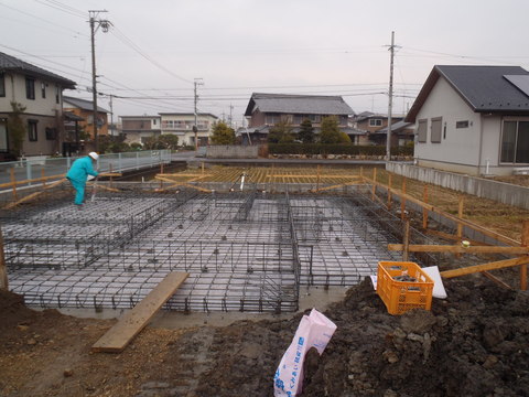 基礎配筋検査 2016.02.12 こんにちは、尾原です。 今週の火曜日は、先日に丁張検査を行ったN様邸へ行ってきました。 現場へ向かう道中に雪がパラつきましたが現場に着いた頃には、雨も止んでいました。 先に、現場へ向かった大野さんは合羽を着て作業をしていました。 今回は、瑕疵保険会社が行う第三者基礎配筋検査の立会でした。 事前に、監理者として基礎配筋検査を行ってましたが、 無事に合格をもらい安心しました。 今後は、型枠やアンカーボルトを設置し、コンクリートの打設に進んでいきます。
