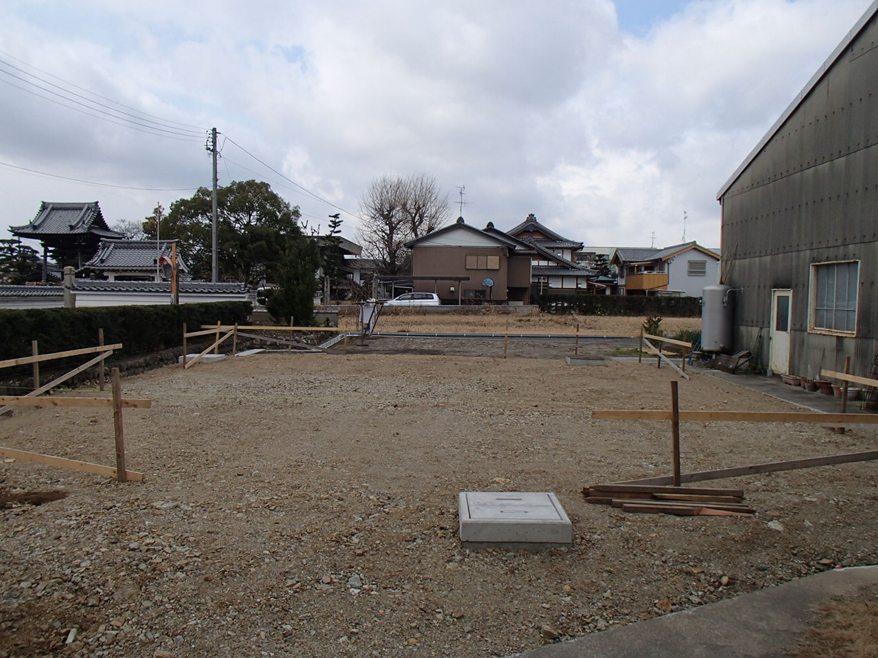 始めにする建物つくり仕事! 2016.02.18 今日は、柘植です。昨日は外の仕事でT 様邸の建物工事の建物位置(丁張り)確認をしました。建物を建てる位置を決めるために水杭を立て水平に水貫を取り付、倒れないように筋カイ貫を固定します。初めに基準となる地面の高さを決め水貫で高さを確認します。続いて水貫の隅角に水糸を四方(通り芯)に張りめぐらせます。これで建物位置をだし配置図の位置を確認します。このような作業から現場がはじまります。今回は、丁張りの説明をさせて頂きました。