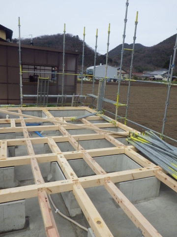 現場状況 2016.03.10 こんにちは、大野です。本日、犬山市で施工中のN様邸先行足場組を上棟を前に行いました。前日の雨を前に大きなシートで養生を行いましたが、ベタ基礎内部に雨水が浸入したので、早々に水抜きを行いました。いよいよ上棟も近くなりました。 又、工事進捗をBlogにてご報告させていただきます!