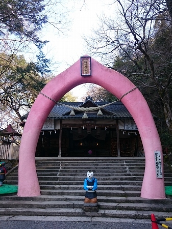 神社の鳥居は、桃型で珍しく「桃型鳥居をくぐれば、悪は去る(サル)、