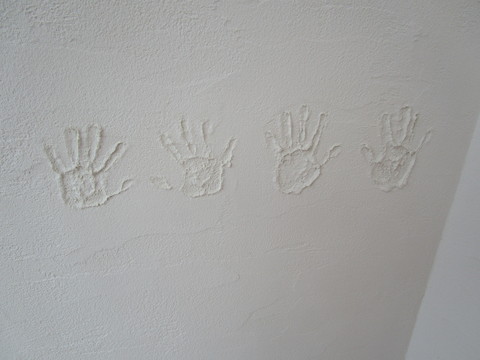 玄関脇の壁にはご家族の手形が映されていました。 漆喰塗り壁(スペイン漆喰)だからこそこんなことが出来ます。