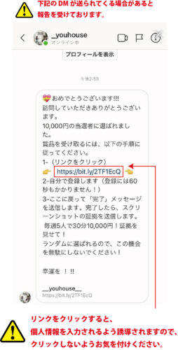 また、YOUHOUSE公式インスタグラムアカウント(__youhouse__)に酷似した偽アカウントから、「10,000円の当選者に選ばれました」などといった内容のDM(ダイレクトメッセージ)が配信される事例が報告されております。