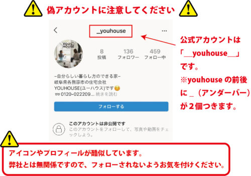 なお、現在までに確認している酷似アカウントは、「youhouse」の前にアンダーバー(_)が入ったものですが、YOUHOUSEとは無関係の偽アカウントです。
