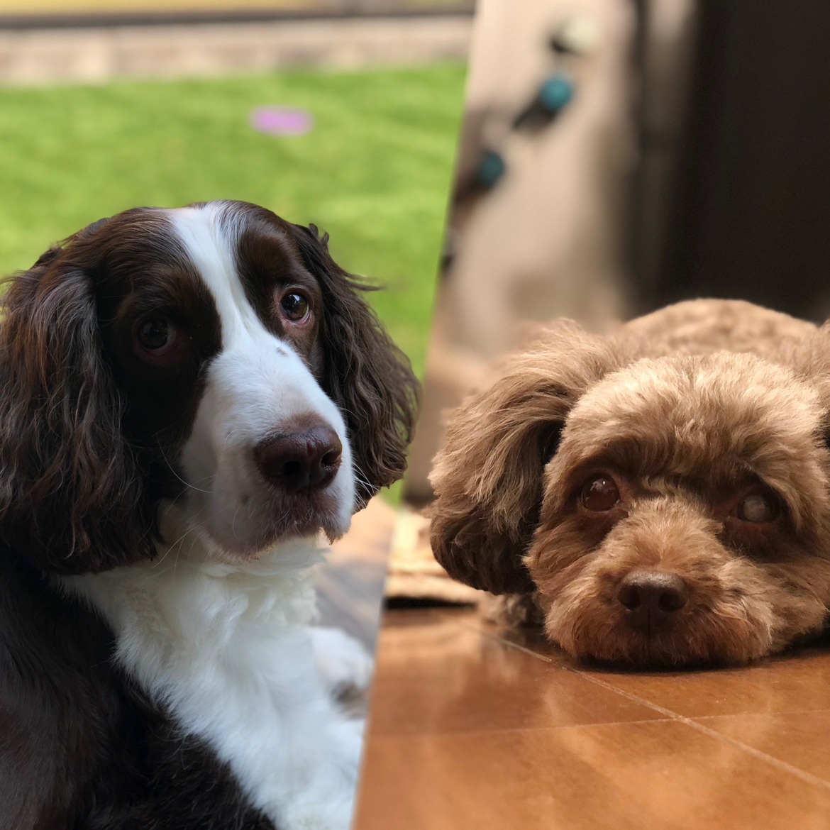 飼っている愛犬たちです!左:メリーちゃん(イングリッシュスプリンガースパニエル)、右:ココちゃん(トイプードル) -