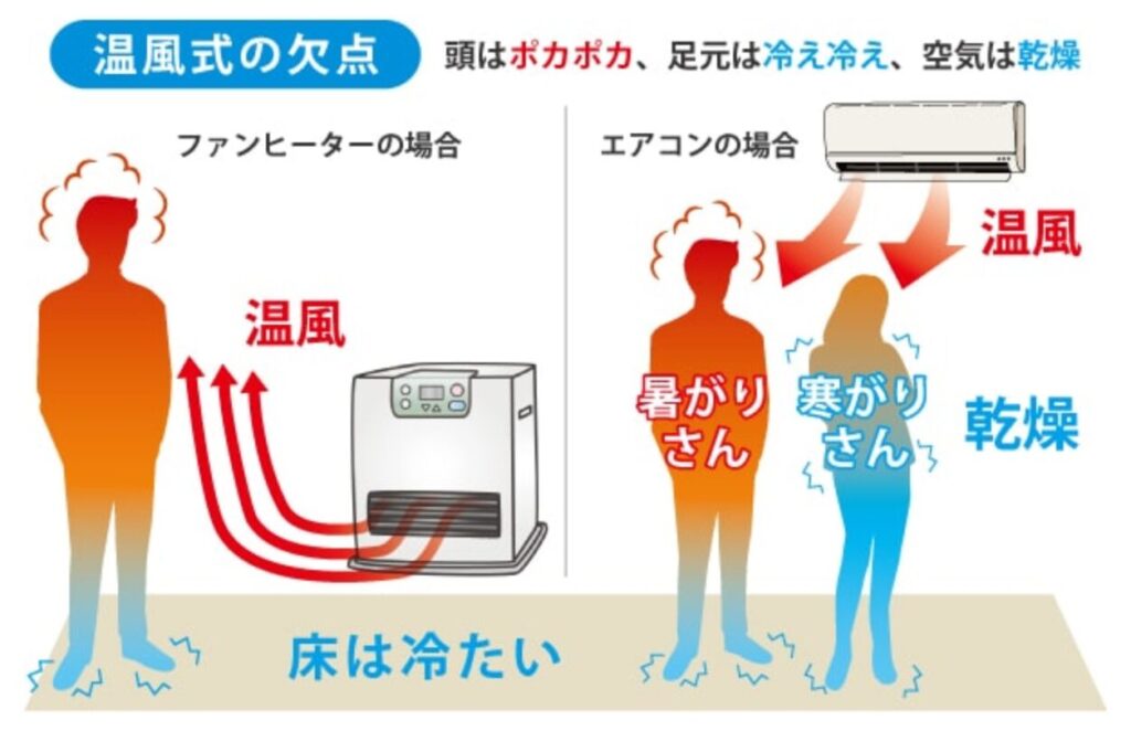 - 特徴:部屋全体を早く温められますが、温風が発生し、乾燥やホコリの舞い上がりの原因になります。