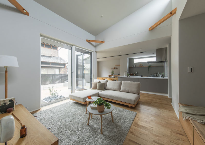 ■ 勾配天井の高い位置に設けた窓から自然光がたっぷり差し込むリビング。