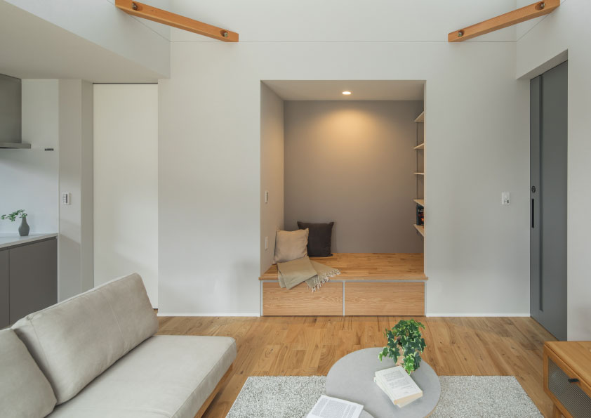 ■ リビングには細部まで「使う人目線」にこだわって考えた三角垂れ壁のヌック。