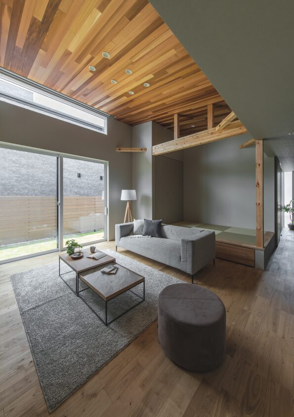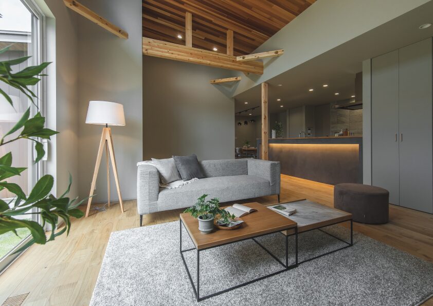 ■ 約24帖の広々したLDKは勾配天井にレッドシダー貼りで開放感と木のぬくもりを演出
