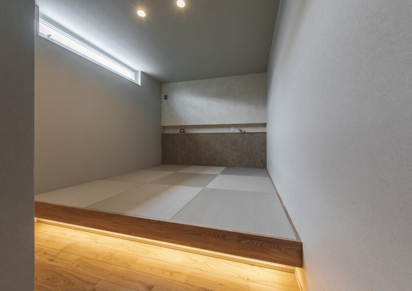 タイルの素材感と間接照明が織りなす上質なリビング空間も注目ポイント