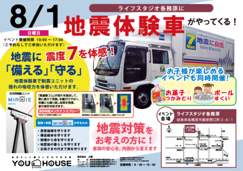 8月1日 ライフスタジオ各務原に地震体験車がやってくる!