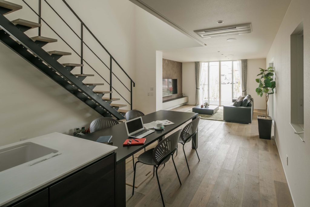 SE構法の採用で柱のない大空間が実現。自然と家族が集まり会話が弾むLDK。