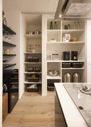 キッチン壁面の大容量扉付き収納。家電から食品まで必要なモノをすべて納めることができます。