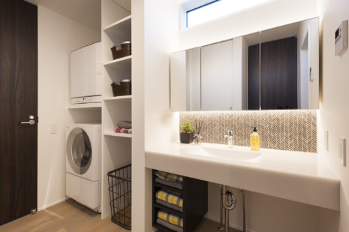 キッチンと繋がる家事ラク動線の洗面・ランドリー。乾燥機付きで雨の日でも、洗濯~収納までワンストップで完了。扉の奥はウォークインクローゼット。