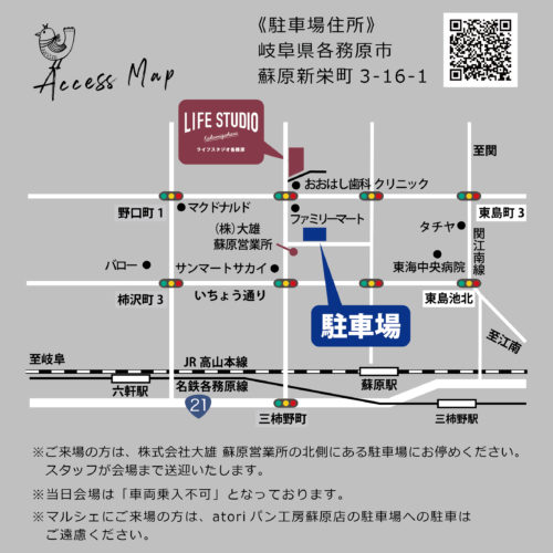 ※ご来場の方は、株式会社大雄 蘇原営業所の北側にある駐車場にお停めください。