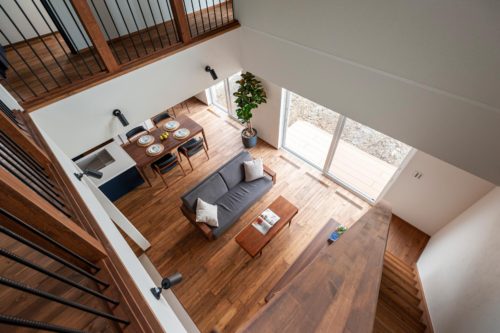 リビングは南向きで明るく、吹き抜けにより解放感も感じられます。